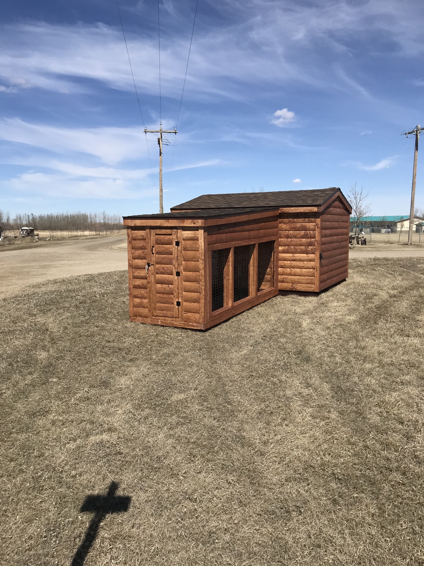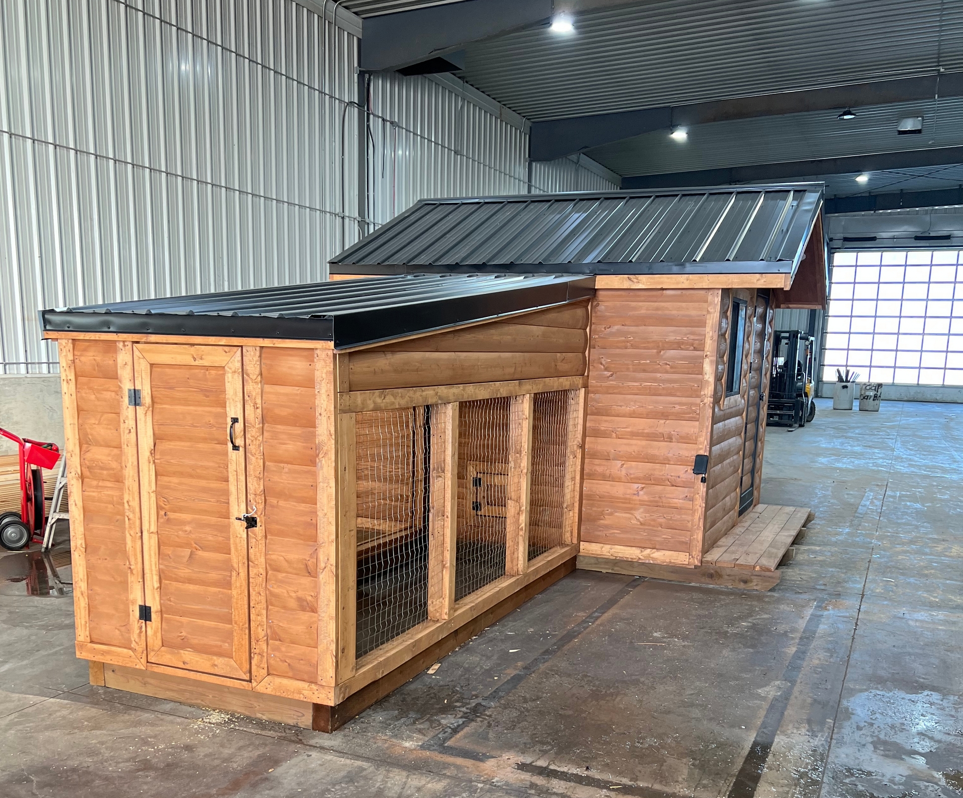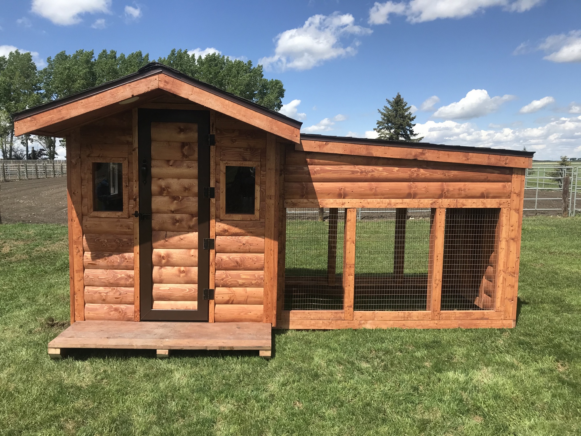 Compact front entry view of our premium wooden chicken coop, featuring sturdy log-style siding, a secure lockable door, and a durable black metal roof.
