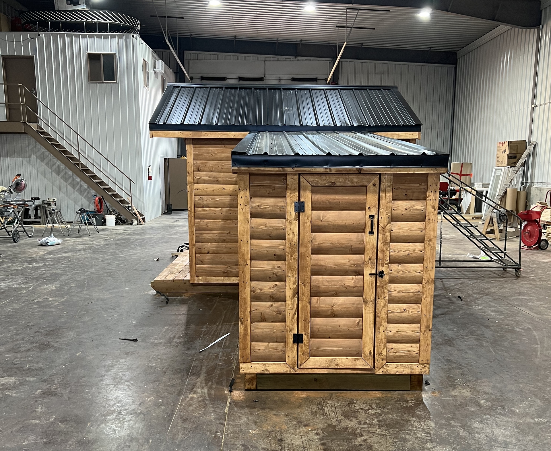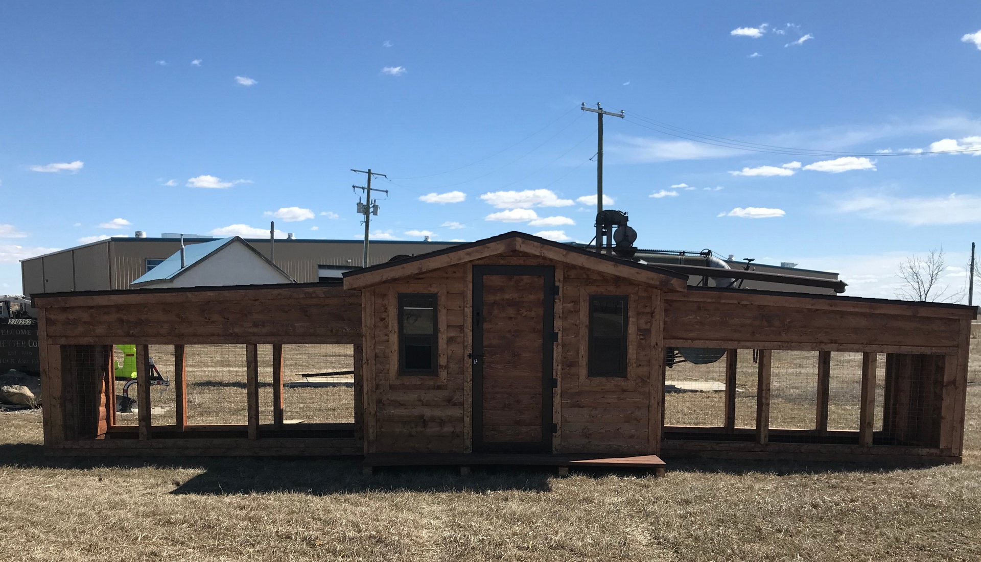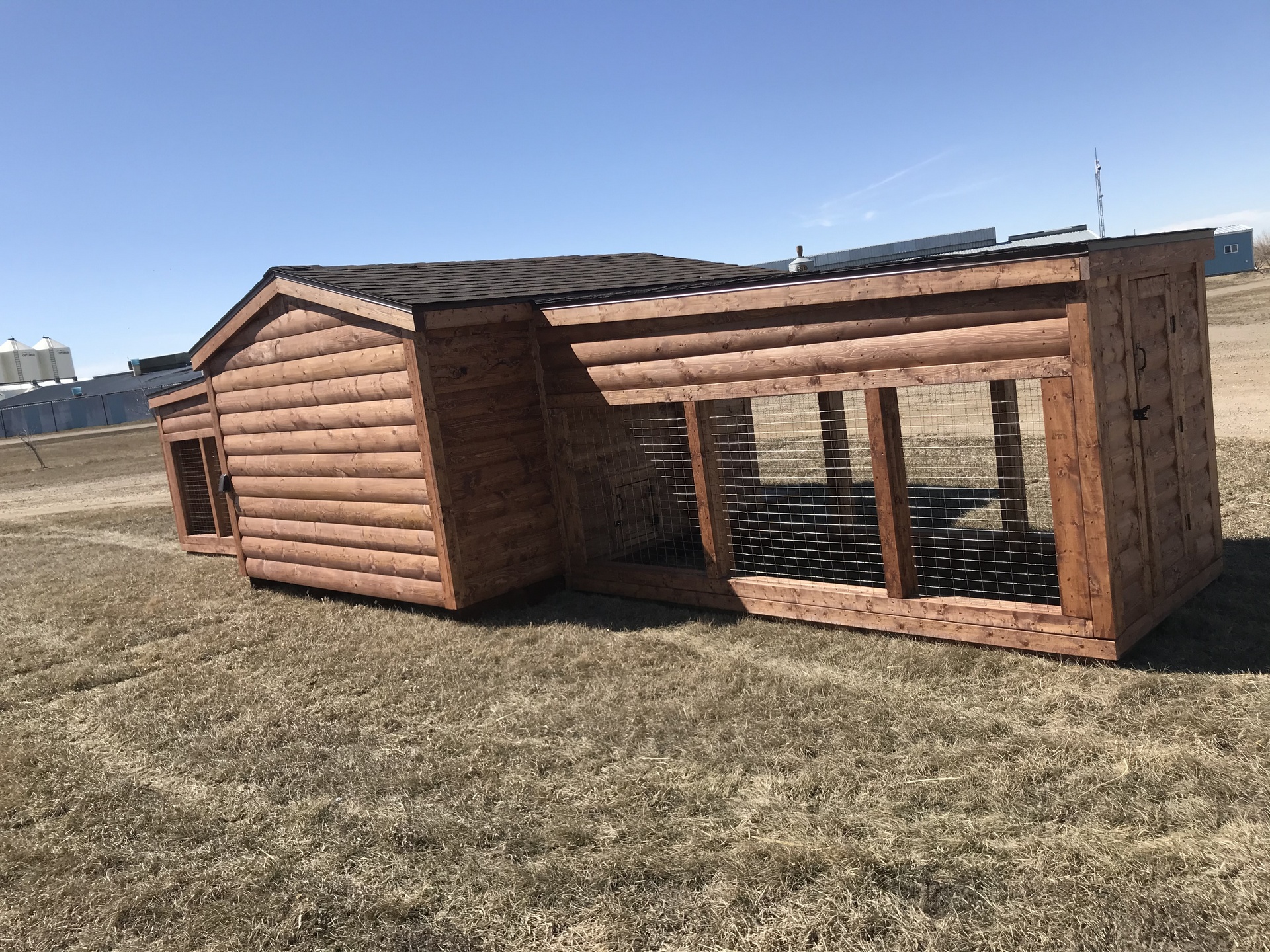 Compact front entry view of our premium wooden chicken coop, featuring sturdy log-style siding, a secure lockable door, and a durable black metal roof.