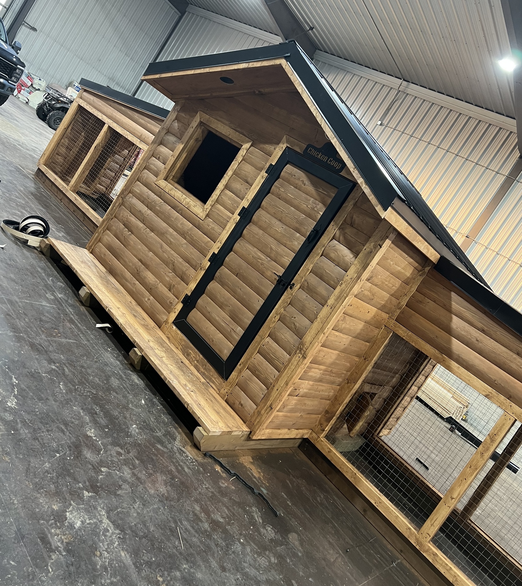 Our handcrafted chicken coops combine rustic charm with practical design to keep your flock safe, comfortable, and happy. Built from high-quality wood with a weather-resistant metal roof, each coop features secure access points, ample ventilation, and a spacious run for outdoor freedom. Designed to last and made to impress, these coops are the perfect home for your chickens year-round.