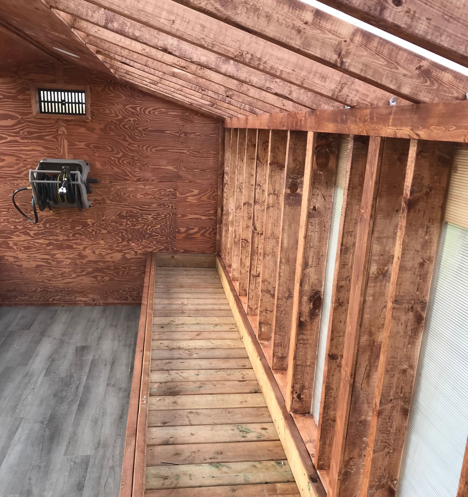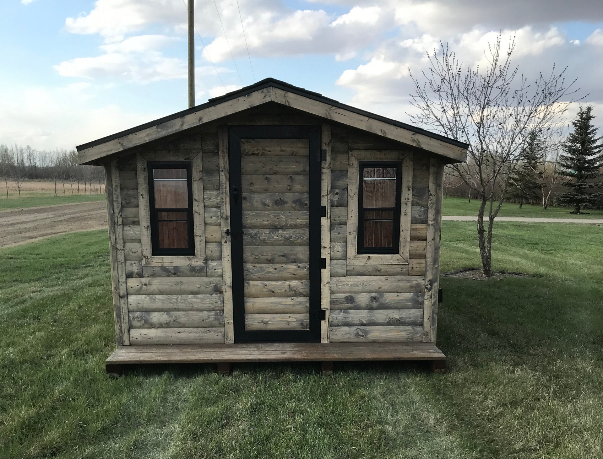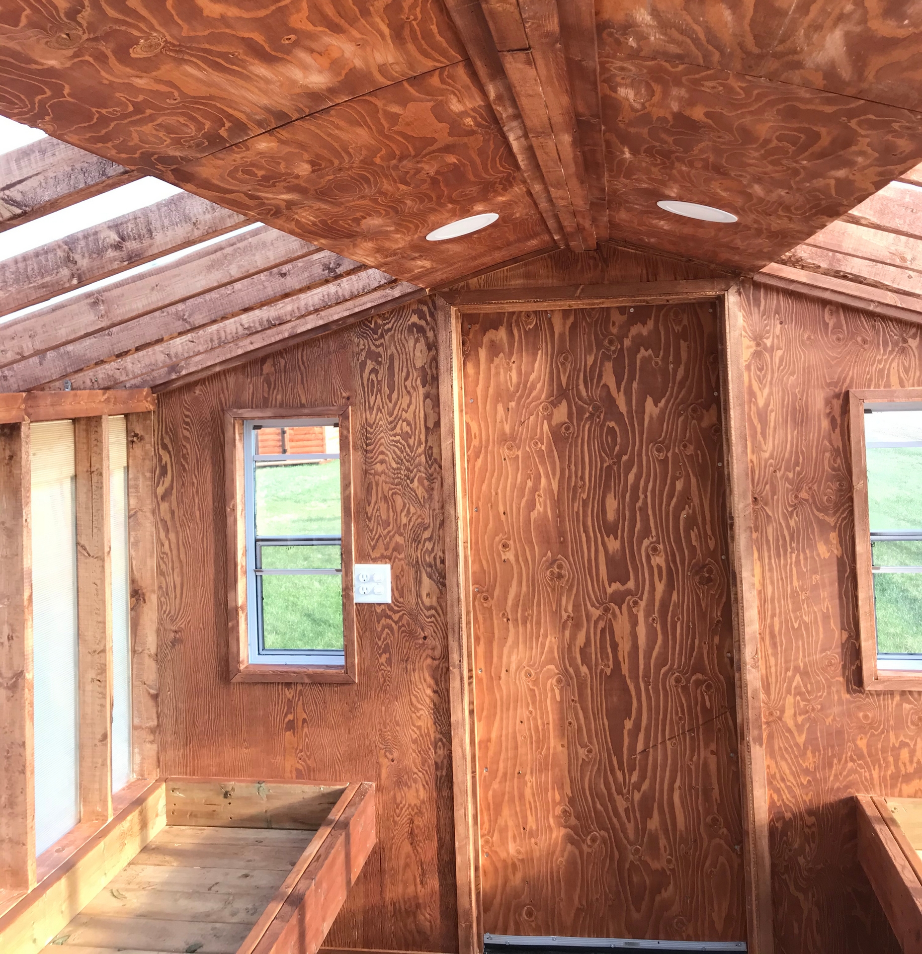 A compact porch and solid door welcome you in, flanked by two operable windows for easy cross‑ventilation. The rustic exterior pairs the charm of a cabin with the function of a working greenhouse.