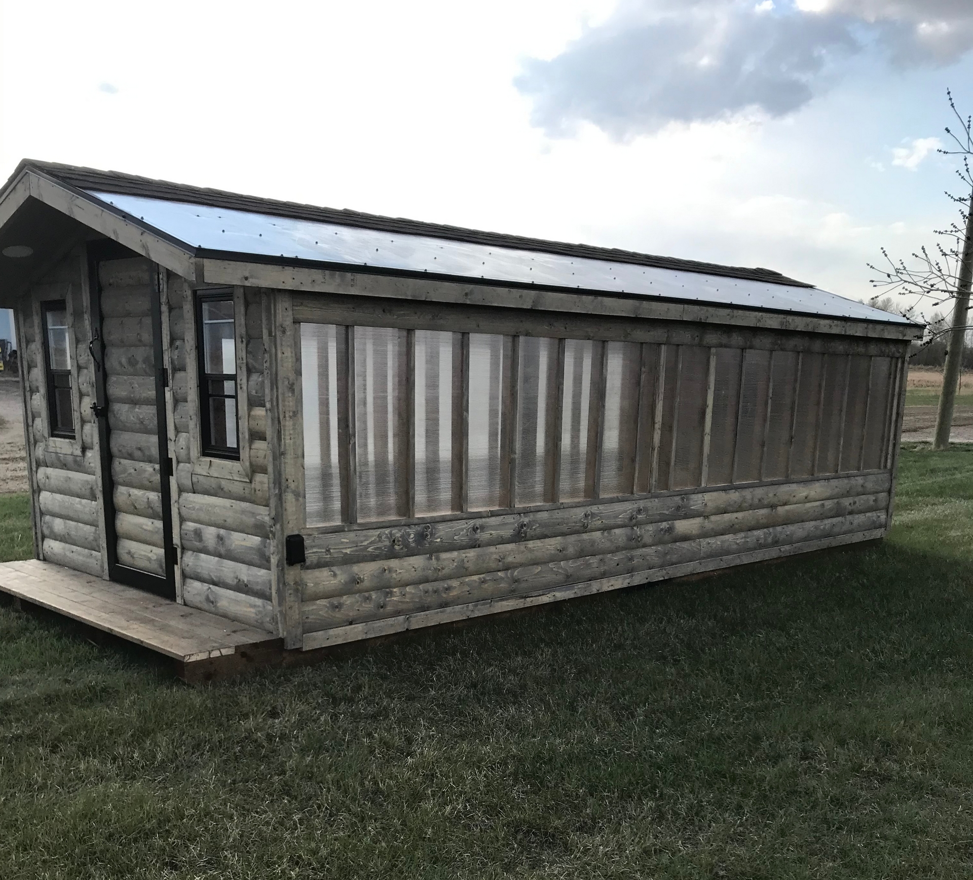 A rustic, log-sided greenhouse with a full-length sun wall and a snug cabin entry. Durable lumber and UV-stable polycarbonate create even light, cut the wind, and stretch your growing season in style.